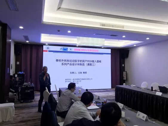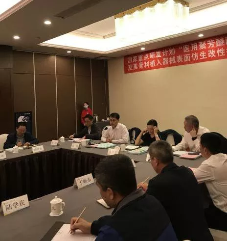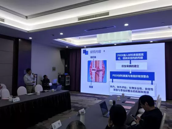 会议上,项目负责人范顺武教授首先介绍了项目的背景意义和研究目标,针对聚芳醚酮作为外科医用材料高度依赖进口的现状,研发国产化的高性能医用原材料与适合国人解剖特点的植入器械迫在眉睫。医用聚芳醚酮的纯化精制难、量产设备缺乏、植入体成骨活性低等是制约国产化的重要因素。项目立足化学、材料工程学、临床医学等多学科交叉热点,开展全链条研究,开发医用级PEEK、高成骨活性M-PAEK和高强度PEK,开发具有优异骨整合性的椎间融合器、智能人工椎体、运动医学锚钉,并开展临床试验。紧接着,各课题负责人就各课题具体实施方案及研究目标分解分工进行了汇报,与会领导与专家认真审议了项目的实施方案,对实施方案总体上表示肯定的同时,针对技术路线的具体细节提出了一些切实可行的改进建议,协助项目组完善了研究方案和技术路线。