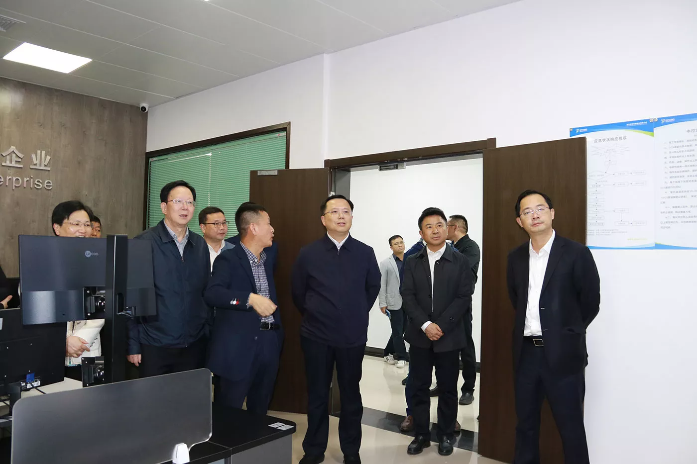 接着,一行领导来到公司中控室进行参观考察,作为公司重要的智能化管理平台,领导们重点对公司人员、工艺、安环管理平台进行相关探讨,高屹书记对以上管理平台给予了充分肯定。同时,王董事长对公司未来在衢州的投资发展情况进行了说明,主要包括投资2亿元的新增年产2000吨特种聚合物合成技术改造项目。一行领导表示,政府将会成为企业未来发展的强大支撑动力,相关利好政策也将继续对企业进行大力扶持。