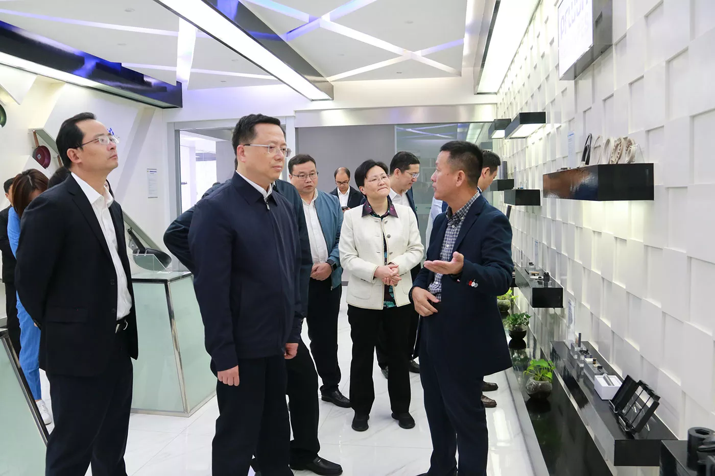 在公司展厅中,王董事长首先对公司与目前整体运营情况进行了简单介绍。在展厅产品样品区域中,一行领导对公司产品及航空航天、汽车工业、生物材料等行业的重点应用有了更为深入的了解。同时,王董事长着重对公司的人才科创板块、研究院建设等相关工作进行了阐述。